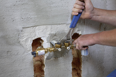 Hier erweist sich die Kombination des Systems Xnet-C15-Dünnschichtsystem von Kermi mit der Anschlussgarnitur Xlink als Lösung. Es genügt ein normaler Heizkörperanschluss, der im alten Bad von einem Flachheizkörper besetzt war. An diesem wird die Xlink-Anschlussgarnitur aufgeschraubt. Über Xlink erfolgt dann die Anbindung an die Ventilgarnitur des Designheizkörpers und auch der Fußbodenheizung. Um die Anschlussgarnitur vor Verschmutzung und Beschädigung während der Bauphase zu schützen, wird zunächst die Vormontageeinheit an den Heizkörperanschluss aufgeschraubt. Diese ermöglicht die exakte Vormontage und die Dichtprüfung der Rohranschlüsse, inklusive Spül- und Entlüftungsventil. Sowohl die Heizkörperanbindung als auch die Fußbodenheizung könnte also bereits angeschlossen und geprüft werden. Nach der Rohbauphase wird die Vormontageeinheit dann durch die Anschlussgarnitur ausgetauscht. Die Vormontageeinheit ist übrigens nach Demontage wieder verwendbar. Die Anschlussgarnitur übernimmt die Regelung des jeweils notwendigen, unterschiedlichen Temperaturniveaus für Heizkörper und Fußbodenheizung. Die unabhängige Temperatureinstellung beider Heizsysteme ist gewährleistet.