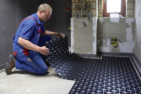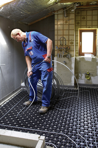 Flächenheizungen geben den Großteil ihrer Wärme über Strahlungswärme ab. Diese wird als die angenehmste Form der Wärme wahrgenommen, vergleichbar mit Sonnenstrahlen. Das Xnet-C15-Dünnschichtsystem ist mit seiner Elementhöhe von nur 14 mm und somit möglichen Fußbodenaufbauhöhen ab 17 mm bei gleichzeitig sehr geringem Gewicht ein echter Renovierungsspezialist. Diese Werte machen eine Fußbodenheizung auch dort möglich, wo sie bisher wegen zu großer Aufbauhöhe nicht realisierbar war. Nach dem anbringen der Randdämmstreifen, kann die Noppenfolie für die Aufnahme des Heizrohres direkt auf vorhandene, tragfähige Untergründe aufgeklebt werden - oder wie im Hause Stasny - auch direkt auf den Estrich. Anschließend wird das sauerstoffdichte Fünf-Schicht-PE-Xc-Rohr verlegt. Der Anschluss erfolgt über den Vorlauf auf der linken Seite der Anschlussgarnitur, der Rücklauf wird nach der Rohrverlegung rechtsseitig verbunden. Als Montagehilfe stehen Rasterbögen für eine einfache 90°-Anbindung von Kunststoffrohren im Wandbereich zur Verfügung. Durch die geringe Aufbauhöhe ist dieses Fußbodenheizungssystem besonders feinfühlig zu regeln und spart obendrein noch Energie.