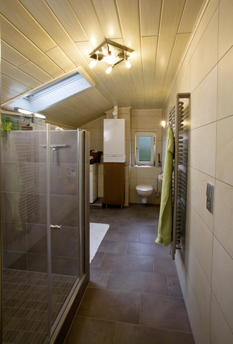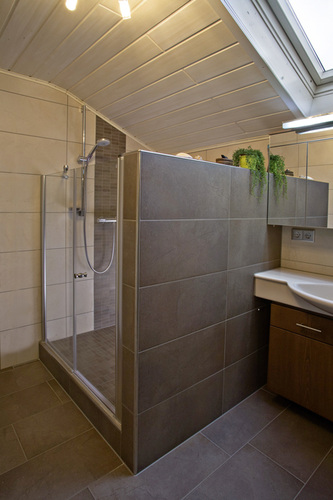 Anstatt der Badewanne wollten die Stasnys einen in der Grundfläche großzügigen Duschbereich mit ausreichend Bewegungsfreiheit umsetzen. Auf Kundenwunsch wurde hierfür während der Umbauphase eine geflieste Nische mit Innenmaß 1,20 x 1,20 m auf Podest eingezogen. Problemlos möglich wäre auch ein Duschbereich in gängiger Standardhöhe mit optional der Dachschräge angepassten Glasschnitt gewesen. Darauf verzichteten Familie Stasny jedoch bewusst. Der Wunsch war es, dass sowohl die Nischenmauerung sowie auch die Duschkabine die gleiche Höhe von 1,60 m haben sollten. Die Grundfläche innerhalb der Duschkabine ist dafür groß genug, damit kein Spritzwasser über die Oberseite austreten kann. Als Nischenlösung wurde eine Bauform der Duschkabinenserie Atea von Kermi eingesetzt - Festfeld links, mit nach innen und außen öffnender Pendeltür. Atea überzeugt mit einem guten Preis-Leistungs-Verhältnis, einfacher Montage und guter Qualität.