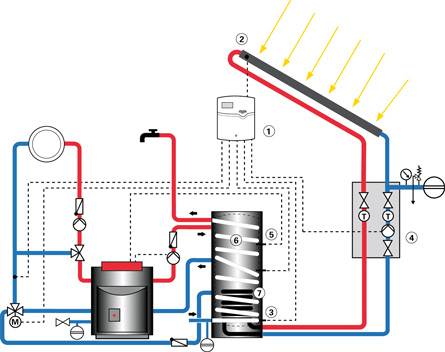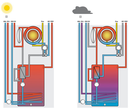 Die Beimischung von Biogas ist in den Technischen Regeln des DVGW bereits geregelt. Auch technisch ist man heute grundsätzlich in der Lage, diese Brennstoffe in Brennwertheizkesseln zu verarbeiten. Moderne Gas-Brennwertgeräte arbeiten bereits mit einer Verbrennungsregelung wie z. B. Lambda Pro Control. Diese erkennt mögliche Qualitätsschwankungen des Gases, wie sie u. a. durch die Einspeisung von Biogas in das Gasnetz entstehen können, und gleicht sie automatisch aus. Dazu wird unmittelbar in der Flamme die Verbrennungsgüte mittels Ionisationselektrode überwacht. Schwankungen der Gasqualität gleicht die Verbrennungsregelung dann zuverlässig durch erhöhen bzw. drosseln der Gasmenge aus. Die Verbrennung bleibt so stabil bei gleich bleibend hohem Wirkungsgrad. Gasförmige und – sobald sie standardisiert und normgerecht angeboten werden – auch flüssige Brennstoffe aus nachwachsenden Rohstoffen können den fossilen Energieträgern beigemischt werden oder diese zum Teil ersetzen. Dazu ist allerdings, was z. B. die synthetischen Brennstoffe betrifft, teilweise noch einiges an Forschungs- und Entwicklungsarbeit zu leisten. Mittelfristig können diese Brennstoffe aber dabei helfen, die natürlichen Vorkommen zu schonen. Dem gegenüber sofort greifen Maßnahmen, bei denen Brennwertheizkessel mit Solarthermieanlagen, Wärmepumpen oder Festbrennstoffkesseln kombiniert werden. Diese Technologien stehen heute bereits zur Verfügung. Sie sind ausgereift, sehr effizient und problemlos zusammen mit einem Öl- oder Gas-Brennwertgerät kombinierbar. Hochwertige Einzelsysteme gewährleisten allerdings noch keinen zuverlässigen und energieeffizienten Betrieb der Gesamtanlage. Das energetische Potenzial kann erst dann voll ausgeschöpft werden, wenn alle Teilsysteme – Brennwertgerät und Solaranlage, Wärmepumpe oder Festbrennstoffkessel – als Gesamtsystem genau aufeinander abgestimmt sind.