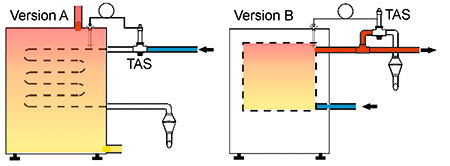 Zwei Varianten mit demselben Effekt können für den Einbau der TAS unterschieden werden. Die Variante A ergibt sich, indem im Heizwasser des Festbrennstoffkessels ein Wärmetauscher angeordnet wird. Dieser ist an die Kaltwasserleitung angeschlossen und mündet mit seinem Ende in Form eines freien Auslaufs über einem Entwässerungsanschluss. Der Kaltwasserzulauf ist über die TAS abgesperrt. Wird der Festbrennstoffkessel trotz fehlenden Wärmebedarfs gut befeuert und seine Heizwasser-Temperatur erreicht so um die 95 °C, bedrängt diese Hitze einen Temperaturfühler. Eine Ausdehnungsflüssigkeit kommt in Wallung, die dann die TAS aufdrückt. Dadurch saust kaltes Wasser durch den Wärmetauscher, der im Heizwasser des Kessels angeordnet ist, nimmt Wärme auf und verabschiedet sich damit in den Abfluss. Klar, so gehen Wasser und Energie flöten, aber auch die Heizwassertemperatur sinkt, was den Festbrennstoffkessel vor der Dampfbildung bewahrt. Wenn man die Situation richtig betrachtet, ist der beschriebene Vorgang also eher eine thermische ZULAUF-Sicherung, was bei der folgenden zweiten Variante nicht der Fall ist. Bei der selteneren und etwas veralteten Variante B dient der Festbrennstoffkessel zur Trinkwassererwärmung. Hierzu muss also ein ständiger Trinkwasserdruck auf dem Kessel lasten, will man doch zwischendurch warmes Wasser zapfen. Bei Überhitzung reagiert die TAS im Warmwasseranschluss dieses Kessels, also auf der Entnahmeseite, und entlässt Warmwasser in einen Abfluss. Die TAS simuliert quasi eine Warm-wasserentnahme, was zum Zufluss kalten Wassers und somit zur Temperaturabsenkung führt.