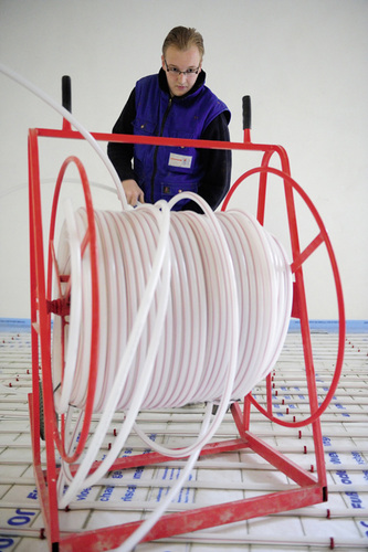 Für ein öffentliches Gebäude wie dem Berufkolleg Olsberg, ist hohe Qualität und Nachhaltigkeit der verwendeten Systeme sehr wichtig. Die beschriebene Flächentemperierung im Olsberger Kolleg, fristet in den meisten Einbausituationen in Deutschland noch ein Leben als schlichte Fußbodenheizung. Üblicherweise wird nur erwärmtes Wasser durch die Anlagen gepumpt. Die Nutzung als Kühlfläche ist jedoch europaweit auf dem Vormarsch. Das hier verwendete vernetzte Polyethylen-Rohr (PE-Xa-Rohr) ist flexibel, schlagzäh und insbesondere unempfindlich gegen Spannungsrisse. Es eignet sich daher für den rauen Baustellenbetrieb. Die Verarbeitung des Trägerelementesystem geht sicher und zügig von der Hand. Mit Hilfe eines Clipmasters werden die Rohrhalter vom Anlagenmechaniker in aufrechter Haltung an den Trägerelementen befestigt. Zusammen mit dem Trägerelementsystem zur Heizung und Kühlung ist im neuen Berufskolleg ein Zementestrich mit einer Überdeckung von lediglich 45 mm über Rohr bei einer für die Schule geforderten Verkehrslast von 5 kN/m² zum Einsatz gekommen. Die nur 45 mm Estrichdicke sollen also auf Dauer einer Belastung 500 Kilogramm je Quadratmeter standhalten. Wer jemals unter einer voll gefüllten Badewanne gelegen hat weiß, was das bedeuten kann. Für das Heizen und Kühlen bedeutete diese geringe Zementestrichüberdeckung auch eine deutlich schnellere Reaktion für die Heiz- und Kühlleistung im Raum. Weniger Estrich bedeutet zusätzliche Vorteile wie geringere Investitionskosten durch Einsparung an umbauten Raum.