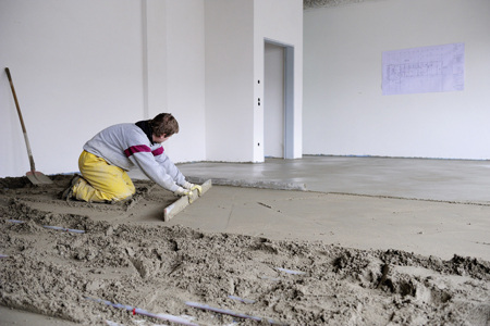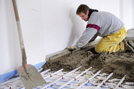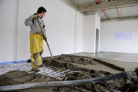 In diesem Berufskolleg sollen ja in erster Linie Schüler und Lehrer untergebracht werden und nicht Rohrleitungen zum Transport von Wärme und Kälte inklusive dem umschließenden Estrich. Ebenso profitiert die Statik durch eine erhebliche Gewichtsentlastung. Hier gilt wie so oft: „weniger ist mehr“. Über der Rohbetondecke gegen beheizte Räume folgt eine entsprechende Dämmung, die den Einsatz gemäß ihrer Nutzlast auch für Klassenzimmer oder Büroräume zulässt. Zusammen mit der stabilen Bewehrung des Trägerelementsystems vermittelt sie eine gute Begehbarkeit sowie hohe Trittschallwerte. Mit Bewehrung ist übrigens nicht gemeint, dass bei einer Wiederholungstat die Existenz als Trägerelement gefährdet ist. Bewehrung meint konkret, dass die auftretenden Kräfte im Estrich durch Stahlmatten aufgenommen werden. Besondere Zusätze im Estrich machen diesen ebenfalls widerstandsfähiger gegen die zu erwartenden Belastungen. Man spricht fachlich von einer Erhöhung der Plastifizierung und eine Verbesserung des Wasserückhaltevermögens. Dies sind Voraussetzungen für eine gleichmäßige und vollflächige Umschließung des Heizrohres und lassen die gewünschte niedrigere Estrichüberdeckung zu. Einige weitere Normen und Anforderungen müssen erfüllt werden. Nicht zuletzt, die Dämmung gemäß EnEV.