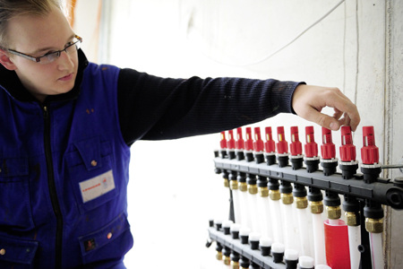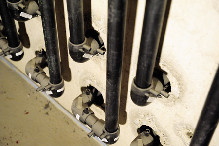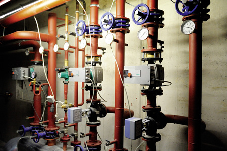 Bei dem Neubau des Berufskollegs mit seinen erhöhten Kühllasten fiel die Entscheidung des Hochsauerlandkreises zur Nutzung einer konventionellen Flächentemperierung zum Heizen und zum Kühlen. Temperierung deshalb, weil nicht - wie schon lange üblich - nur geheizt wird über die „Heizschlangen“ im Estrich. Im Umkehrfall kann auch gekühlt werden. Temperieren meint also niedrige Raumtemperaturen nach oben und zu hohe wieder nach unten zu bewegen. Wichtig war dabei die korrekte Auslegung des Systems (hier Classic von Uponor), um die Möglichkeit zur stillen und zugfreien Raumkühlung als Zusatznutzen der Flächenheizung effizient einzusetzen. Für die 4000 m² verlegten, nach Verfahren Engel hochdruckvernetzten Polyethylenrohre (PE-Xa-Rohre), wurde bei dem verwendeten System eine Rohrdimension von 20 mm bei einem Verlegeabstand von 10 und 15 cm gewählt, um die gewünschte maximale Kühlleistung von 60 kW zu erreichen. Die Dimension von 20 mm empfahl sich, da im Kühlfall zur Vermeidung von Taupunktunterschreitung mit einer geringeren Temperaturspreizung von 5 K oder kleiner gearbeitet werden soll. In diesem Fall müssen im Vergleich zum konventionellen Heizbetrieb größere Wassermengen umgewälzt werden.