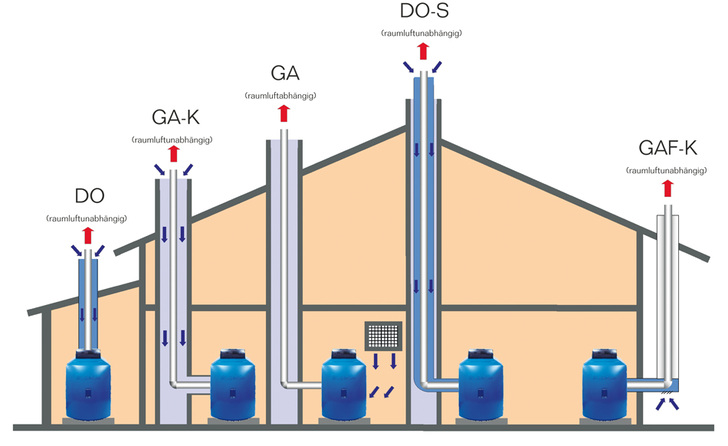 Der Standard für das Abgasrohr für Kesselleistungen im Einfamilienhaus liegt heute bei DN 80. Diese Abmessung ermöglicht den nachträglichen Einbau in die meisten vorhandenen Schornsteinschächte. Um den energetischen Nutzen eines raumluftunabhängig betriebenen Heizkessels zu optimieren, empfiehlt sich der Einbau eines geeigneten Luft-Abgassystems. Hier sind zwei Varianten möglich: die Luft-Abgasführung in räumlich voneinander getrennten Rohrsystemen und die konzentrische Luft-Abgasführung, bei der das Abgas im Innenrohr nach außen abgeführt und die Verbrennungsluft im Ringspalt des Außenrohres angesaugt wird. Die zweite Alternative bietet zusätzliche energetische Vorteile, weil nach dem Gegenstromprinzip die Wärme der Abgase teilweise an die Verbrennungsluft übertragen werden kann. Durch diese Vorwärmung muss der Brenner weniger Energie aufwenden, um die kalte Verbrennungsluft zu erwärmen – der Anlagen-Nutzungsgrad steigt.