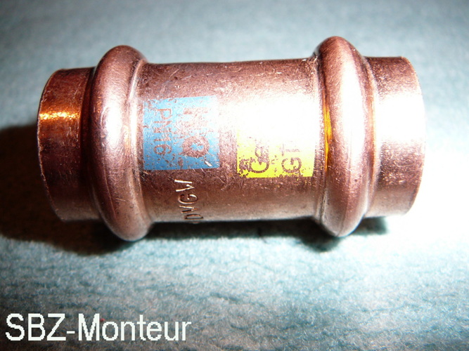 Die weiteren Abkürzungen auf dem Fitting bestehen aus den eingestanzten Buchstaben "fb" eventuell für den Hersteller oder Importeur und DVGW. Keine Spur von "unverpresst undicht", die Sicke fehlt nämlich.