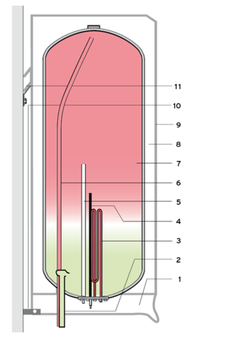 Zwischen Ummantelung (9) und Innenbehälter (7) befindet sich eine Wärmedämmung (8), die den Speicher ausgezeichnet gegen Wärmeverluste schützt. Der Innenbehälter ist zum Schutz gegen Korrosion feueremailliert und mit einer Schutzanode ausgestattet.