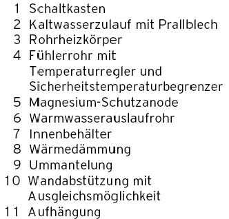 Die Art der Warmwassererzeugung bei den Elektrospeichern ist einfach, aber effektiv: Beim Öffnen eines Warmwasserzapfventils strömt das Kaltwasser durch das Kaltwassereinlaufrohr (2) in den Speicher und drückt das sich dort befindliche Warmwasser durch das Warmwasserauslaufrohr (6) heraus. Beim Einlauf des Kaltwassers vermindert ein Prallblech das Vermischen von heißem und kalten Wasser, so dass möglichst lange heißes Wasser gezapft
