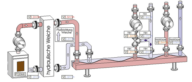 Das Wohnhaus wird im Erdgeschoss mit einer Fußbodenheizung und im Obergeschoss über Heizkörper beheizt. Die Fußbodenheizung benötigt bei Volllast rund 1 Kubikmeter Wasser pro Stunde (m³/h). Im Obergeschoss befinden sich Heizkörper die nochmals andere Temperaturen als die in der Fußbodenheizung bevorzugen und einen Volumenstrom von 0,5 m³/h benötigen. Die technischen Angaben des Kesselherstellers begrenzen den maximalen Volumenstrom auf 1,2 m³/h. Rein rechnerisch passt die Hydraulik der Verbraucher (Fußbodenheizflächen, Heizkörper) nicht zu der des Wärmeerzeugers. Schließlich ergeben 1 m³/h und 0,5 m³/h immer noch 1,5 m³/h und nicht 1,2 m³/h. Um den Erzeuger unabhängig von den Verbrauchern betreiben zu können wird eine hydraulische Weiche installiert. Die Pumpe des Wärmeerzeugers soll bei Volllast 1,2 m³/h fördern. Der Förderstrom der beiden Heizkreise wird nun durch die hydraulische Weiche ermöglicht. Der Differenzvolumenstrom von 0,3 m³/h wird durch das Rücklaufwasser der Verbraucher mitten durch die Weiche geschleust.