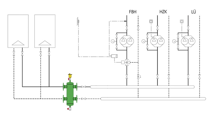 Mit der hydraulischen Weiche sind natürlich nicht alle hydraulischen Probleme beseitigt. Weder lässt sich der hydraulische Abgleich durch Einsatz der Weiche ersetzen, noch ist die Pumpendimensionierung überflüssig. Die Weiche entzerrt Probleme der Hydraulik in dem primärer (Erzeugerkreis) und sekundärer Kreis (Verbraucherkreis) unbeeindruckt voneinander ihr Tagewerk vollbringen. Dies gilt auch dann, wenn über z. B. mehr als einen Wärmeerzeuger nachgedacht wird. Gerade Mehrkesselanlagen oder gemischte Anlagen sind ohne hydraulische Weichen nicht denkbar.