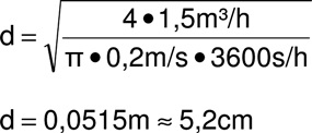 Hier nun die Bauanleitung einer Weiche (natürlich nur zum Verständnis, da die heutigen Löhne den Selbstbau oft unwirtschaftlich erscheinen lassen). Man ermittle den höchsten Volumenstrom der Heizungsanlage. Man unterscheidet Erzeugerseite (im Beispiel maximal 1,2 m³/h) und Verbraucherseite (im Beispiel unter Volllast 1,5 m³/h). Für die Maximalbelastung (im Beispiel also 1,5 m³/h) wird nun die magische Geschwindigkeit 0,2 m/s als maximale Fließgeschwindigkeit festgelegt. Gesucht wird also ein Stück Rohr das 1,5 m³/h Volumenstrom mit maximal 0,2 m/s transportiert. Der formelle Ansatz ist dann: