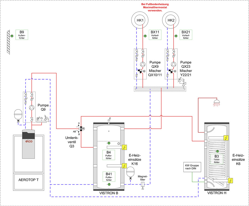 Gegeben ist ein Mehrfamilienhaus mit sechs Wohneinheiten. Drei Wohneinheiten sind für ein Paar, die anderen drei Wohneinheiten für eine dreiköpfige Familie ausgelegt. Jede Wohneinheit verfügt über eine normale sanitäre Ausstattung mit Dusche, keine Schwallbrausen sind verbaut. Die Heizlast wurde mit 15 kW ermittelt, Aufstellort ist 76131 in Karlsruhe. Im Gebäude ist nur Fußbodenheizung verbaut, die Vorlauftemperatur im Auslegungspunkt beträgt 35 °C. Mit dem EVU wurde ein Wärmepumpentarif abgeschlossen und maximal 2 h Sperrdauer am Tag vereinbart. Der Gebäudeeigentümer wünscht eine monovalente Betriebsweise. Monovalent bedeutet, dass die Wärmepumpe der alleinige Wärmeerzeuger ist und die volle Heizleistung bei der entsprechenden Normaußentemperatur erbringt.