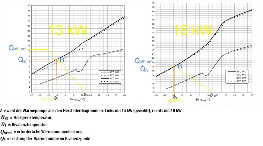 Bei dem Hersteller unseres Vertrauens finden wir bei der Normaußentemperatur von -10,1 °C nun zwei Modelle: Einmal mit 18 kW und einmal mit 13 kW. Die größere Wärmepumpe ermöglicht fast den vom Bauherrn gewünschten monovalenten Betrieb, die kleinere Wärmepupe kann monoenergetisch betrieben werden. Bis zum Bivalenzpunkt von -5 °C Außentemperatur erbringt die Wärmepumpe die notwendige Heizlast, dann kommt der Heizstab unterstützend hinzu.