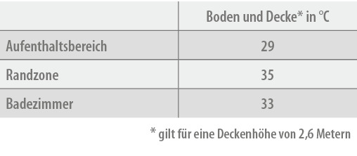 Mit den Kennlinien gem. DIN EN 1264 aus den Planungsunterlagen der Systemhersteller ist sowohl die Oberflächentemperatur als auch die notwendige Heizmitteltemperatur im Verhältnis zur Raumtemperatur zu ermitteln.