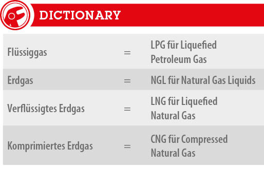 Die internationale Sprachregelung bezeichnet dagegen eindeutig Flüssiggas als „Liquefied Petroleum Gas“ (LPG), verflüssigtes Erdgas als „Liquefied Natural Gas“ (LNG) und komprimiertes Erdgas als „Compressed Natural Gas“ (CNG). Letzteres kommt in Erdgasfahrzeugen als Kraftstoff zum Einsatz und sollte nicht mit Autogas (LPG) verwechselt werden.