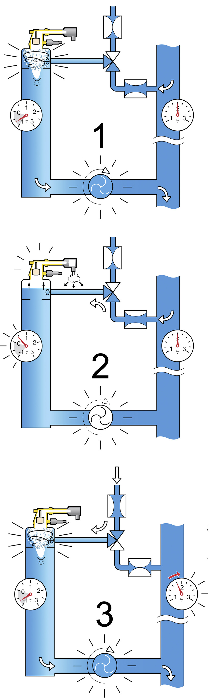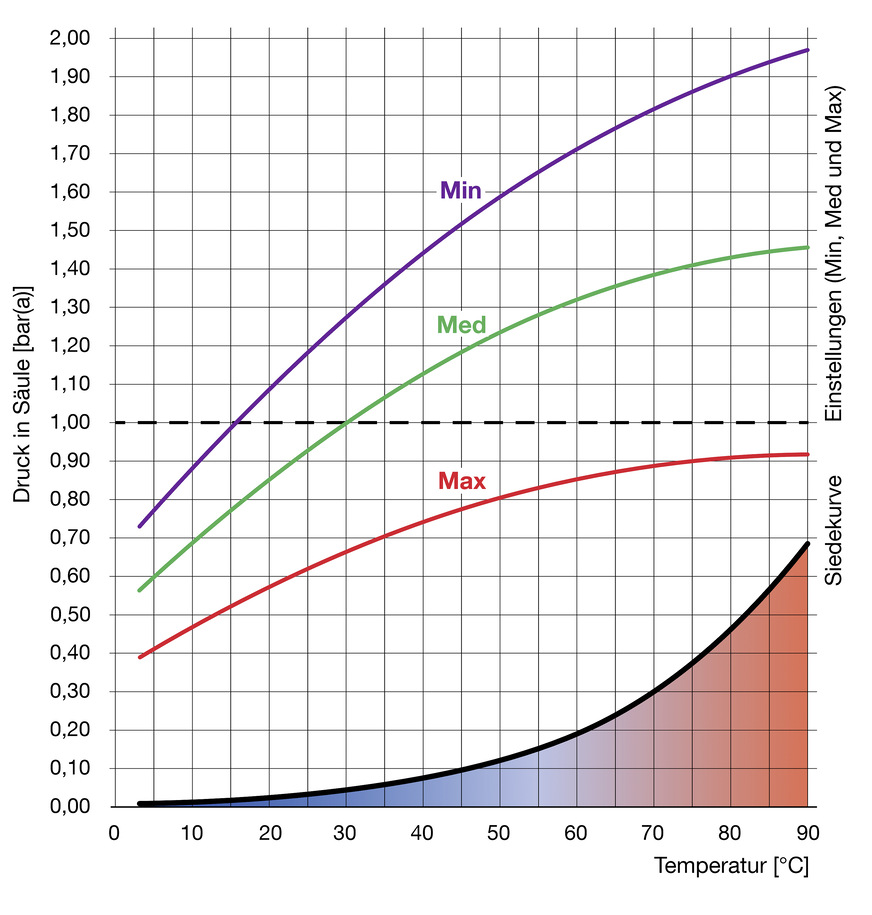 Bei geschlossenen Heizungsanlagen ist der Dampfdruck temperaturabhängig. Wird das Wasser beim Entgasen auf ein Vakuum von 0,3 bar absolut bzw. –0,7 bar herabgesetzt, sinkt auch die Temperatur, die benötigt wird, um den kritischen Punkt der Dampfdruckkurve zu erreichen. Sie liegt dann bei lediglich rund 70 °C. Folglich besteht beim Erreichen dieser Gradzahl die Gefahr, dass das Wasser von der flüssigen Phase in die gasförmige übertritt und Wasserdampf abgelassen wird. Diesem Zustand gilt es vorzubeugen, da thermische Energie vernichtet wird und mechanische Bauteile beschädigt werden können.
