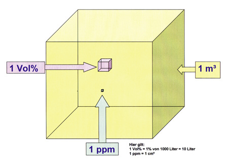 Beispielsweise darf der Wert für Kohlenmonoxid, also der CO-Wert, als maximale Arbeitsplatz-Konzentration (MAK), einen Wert von 60 ppm nur kurzzeitig überschreiten und sollte ansonsten unter 30 ppm bleiben. Dieser auch als MAK-Wert bekannte Grenzwert ist in seiner Schädlichkeit und der Einheit „ppm“ gut handhabbar. Jedenfalls besser, als würde man diese Spuren des giftigen Gases beschreiben als maximal sechs von einhunderttausend Teilen. Auch 0,006 % bzw. 0,003 % kennzeichnen die MAK-Werte an CO nicht gerade augenfällig. Der Sprachgebrauch für Sauerstoff in der Luft hingegen bleibt, wegen der anteiligen Menge jedoch bei Prozent als Messeinheit stehen. Sauerstoff ist daher mit 21 % Anteil in der Umgebungsluft enthalten und kaum jemand wird dies auf beängstigende 210000 ppm hochstilisieren wollen.
