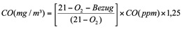 Noch aufschlussreicher angesichts der Problematiken, die zukünftig zu lösen und zu bewerten sein werden, sind die Aussagen über den jeweiligen Schadstoffanteil, bezogen auf die gewonnene Energie. So kann - wie bereits am vorhergehenden Beispiel für CO gezeigt - dessen Aufkommen bezogen auf die erzeugte Energiemenge dargestellt werden. Diese Werte lassen sich als Tabellenwerte ablesen und für ein gemessenes Ergebnis sehr leicht umrechnen. So gilt beispielsweise für den Anfall von CO zur Umrechnung bei der Verbrennung von