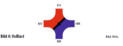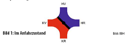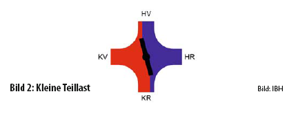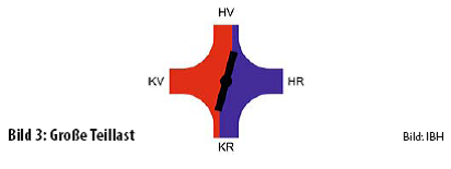 Der Vier-Wege-Mischer kann derartig gut abriegeln, dass der Kesselkreis komplett von den Heizkörpern getrennt wird. Dann, wenn also der Kreis des Kesselvorlaufs (KV) zum Kesselrücklauf (KR) komplett geöffnet ist, befindet sich anfangs erwärmtes Wasser im Kessel, welches sich allmählich abkühlt und damit zusammenzieht. Befindet sich in diesem Zustand das Membranausdehnungsgefäß im Kreis der Heizkörper, kann es im Kessel zu einem Unterdruck kommen. Dies kann zum Eintritt von Luft in den Kessel führen und sollte daher verhindert werden.