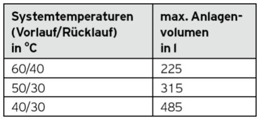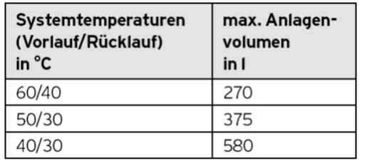WICHTIG: Kann mit dem Geräteintegrierten ADG bei den jeweiligen Systemtemperaturen das maximale Anlagenvolumen nicht abgesichert werden, muss ein (zusätzliches) bauseitiges ADG eingesetzt werden!