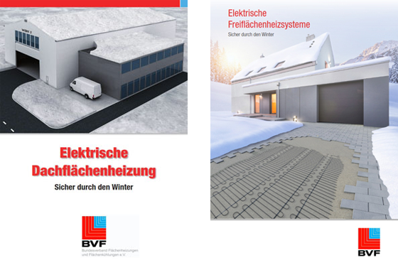 Kostenlose Broschüren wie Elektrische Freiflächenheizsysteme – Sicher durch den Winter und Elektrische Dachflächenheizung – Sicher durch den Winter stehen auf der Website des BVF zum Download bereit.