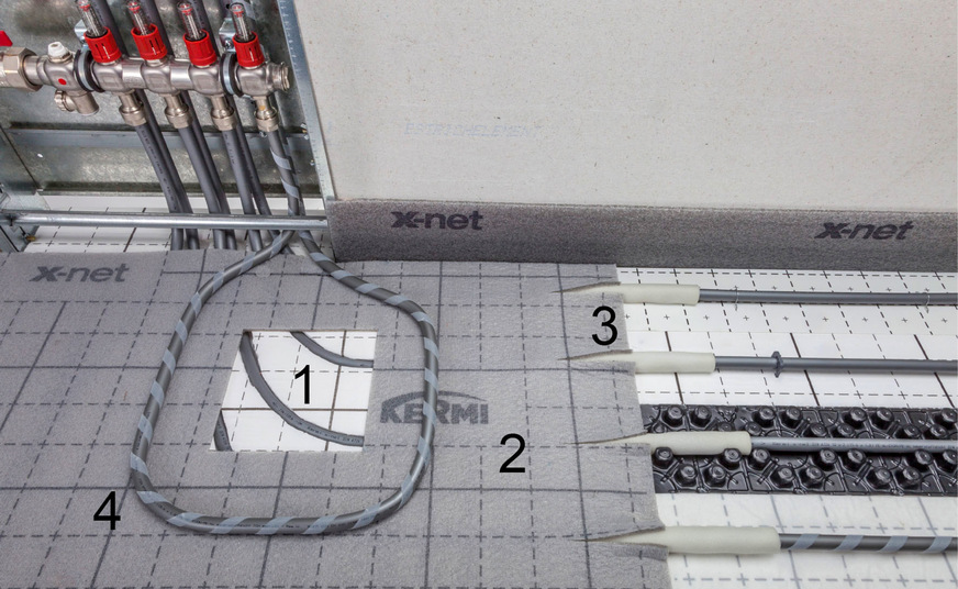 Als Hersteller für Raumklima-Systeme hat Kermi 2016 eine praxisgerechte Lösung vorgestellt, die bis heute nichts an Aktualität verloren hat: Kermi x-net connect führt die durchlaufenden Zuleitungen ab dem Verteiler zunächst in eine Dämmebene unter dem Estrich und lässt sie erst bei den zu beheizenden Räumen in die Estrichebene eintauchen. Auf diese Weise wird die Heizungswärme gezielt unter dem Estrich hindurch geleitet und somit unerwünschte Wärmeabgabe unterbunden. Die dabei erreichten Dämmwerte sind mit einer konventionell in den Estrich eingebettet gedämmten Rohrleitung – aufgrund der dann erforderlichen zusätzlichen Estrichdicke – in der Baupraxis nicht zu realisieren.