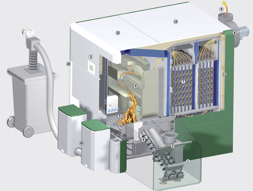 Die anfallende Flugasche wird mittels Schnecke in den frontseitigen Aschenbehälter befördert.
