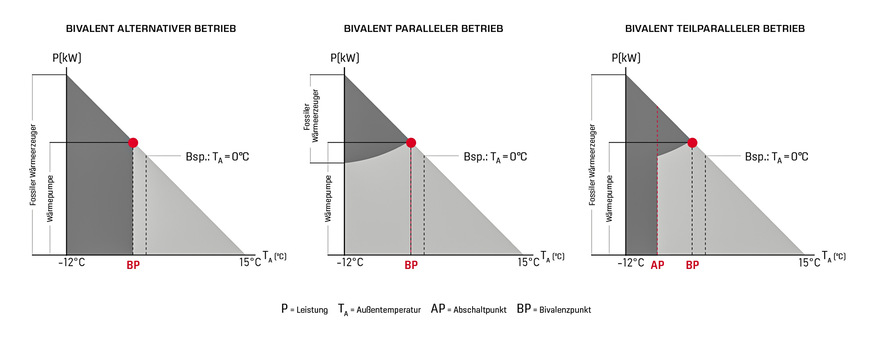 Eine wesentliche Rolle spielen dabei der Bivalenzpunkt (BP) sowie der Abschaltpunkt (AP), zwei feste oder (teil)variable Außenlufttemperaturwerte, welche projektspezifisch ausgelegt werden: