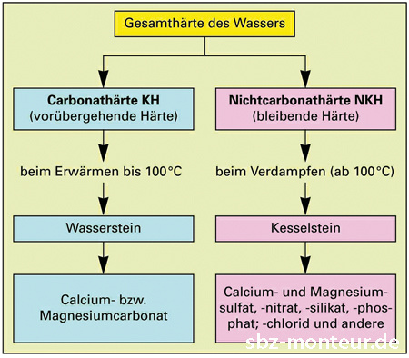 Die Gesamthärte wird auf die Ionen des Calciums und des Magnesiums bezogen. Beide sind positiv geladen. Um die elektrische Neutralität der Lösung zu wahren, muss die gleiche Menge negativ geladener Ionen vorhanden sein. In Deutschland mit seinen ausgesprochen mächtigen Kalklagerstätten sind dies meist Karbonat bzw. Hydrogencarbonat. Es wird dann von Karbonathärte (KH), Kalkhärte oder auch temporärer Härte gesprochen. Die Salze des Magnesiums, Calciums und der Kohlensäure (Karbonate) sind sehr schwer löslich. Kohlensäure ist zudem eine schwache Säure und eine flüchtige dazu. So können folgende Eigenschaften angegeben werden.