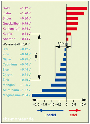 Im Falle der Kunststoffe hat diesen Vorgang die Natur bereits erledigt, in dem aus Wasser, Kohlensäure und Licht Erdöl wurde. Alle diese Werkstoffe gleichen in gewisser Weise einer gespannten Feder, die wieder in die energetisch günstigere Ausgangssituation gelangen möchte. In der Regel geschieht das, jedoch nur sehr langsam. Diesen Vorgang der „kalten – weil langsamen – Verbrennung“ bezeichnet man neben anderen Arten auch als Korrosion. Immer wenn Substanzen mit Sauerstoff reagieren, werden Elektronen ausgetauscht. Das bedeutet, es fließt ein elektrischer Strom (Batterieprinzip) der in diesem Zusammenhang als Korrosionsstrom bezeichnet wird. Wird der Stromfluss unterbrochen, bildet sich eine elektrische Spannung aus. Alle Materialien können unter darlegten Bedingungen mit einem definierten Nullpunkt verglichen werden. Daraus ergibt sich eine elektrochemische Spannungsreihe.