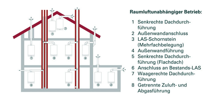 Der SHK-Anlagenmechaniker findet bei der Installation von Heizkesseln immer wieder andere bauliche Gegebenheiten vor. Querschnitt, Länge sowie die Anzahl von Bögen und Winkeln in der Abgasabführung können variieren und dementsprechend unterschiedliche Strömungswiderstände verursachen. Bei den üblichen Gas-Heizkesseln müssen deshalb bei der Erstinbetriebnahme die unterschiedlichen Strömungsverhältnisse gegebenenfalls durch entsprechende Auslegung und den Einbau von Blenden sowie durch individuelle Einstellungen an der Regelung berücksichtigt werden.