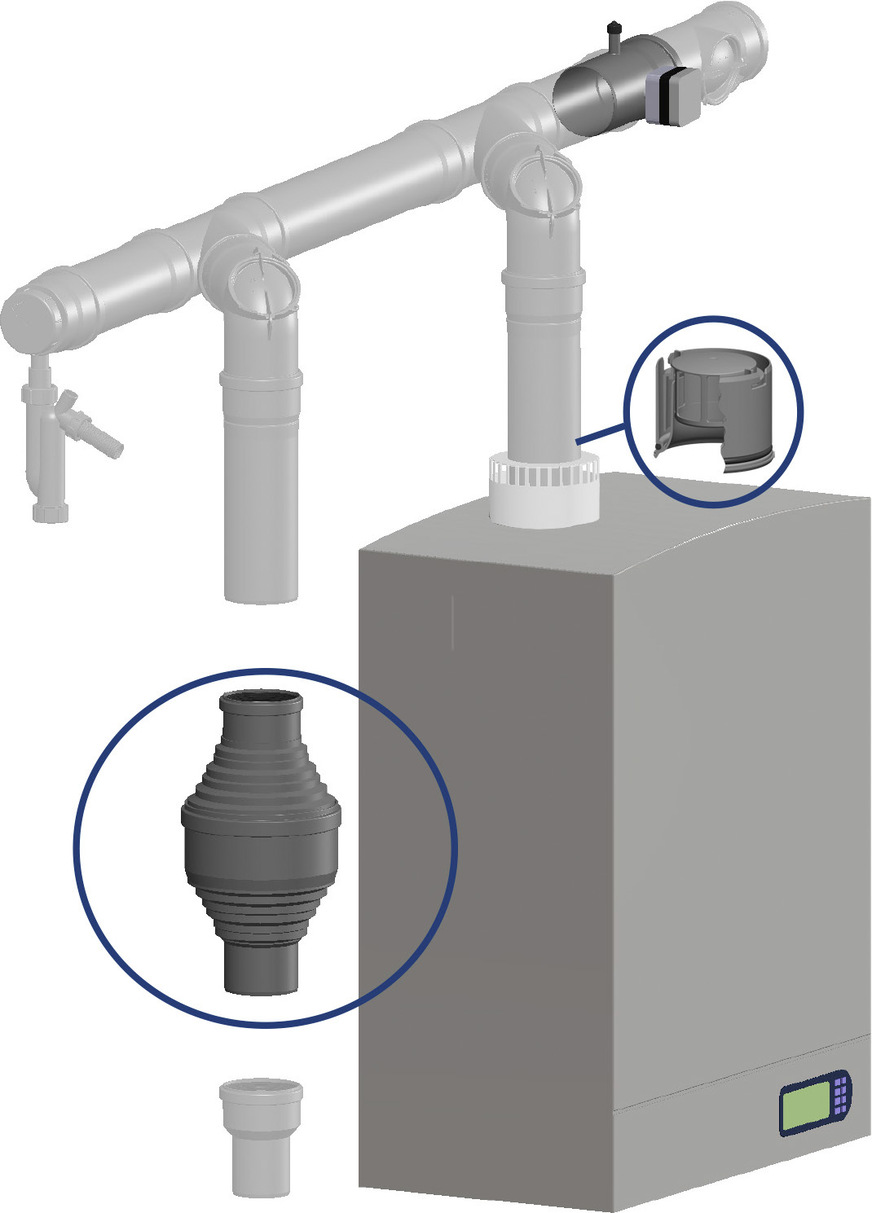 Die Montage funktioniert problemlos in einwandigen sowie konzentrischen Abgasleitungen DN 80/125. Der integrierte Siphon hält einem Gegendruck von bis zu 350 Pa stand.