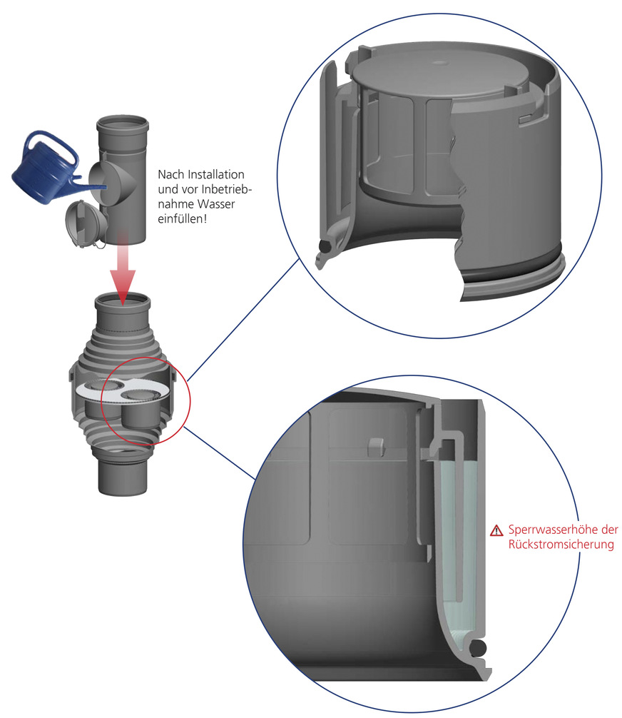 Um Stauwasser auf der RSS zu vermeiden, hat die RSS einen integrierten Kondensatauslass mit Siphonfunktion. Der integrierte Siphon hält einem Gegendruck von ca. 350 Pa stand. Damit der Siphon funktioniert, muss dieser mit Wasser gefüllt sein. Im Betrieb füllt das rücklaufende Kondensat den Siphon dauerhaft. Vor der ersten Inbetriebnahme muss der Siphon jedoch einmalig gefüllt werden. Zur Kontrolle und Befüllung ist daher oberhalb der Rückstromsicherung eine Kontroll-Öffnung vorzusehen. Die Installation der RSS in einen Kontroll-Bogen bzw. einem Kontroll-Rohr ist daher prädestiniert.