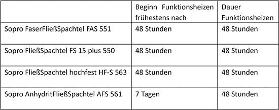 Entgegen dem klassischen Estrichsystem kann dieses Procedere bei Verwendung von Sopro Fließspachtelmassen deutlich früher begonnen und zudem auch verkürzt durchgeführt werden. Dies liegt an dem dünnschichtigen Aufbau des Gesamtsystems. Das Funktionsheizen beginnt damit, dass die Fußbodenheizung anfangs für 24 Stunden mit einer Vorlauftemperatur von 25°C betrieben wird. Im Anschluss hieran folgt für weitere 24 Stunden der Betrieb der Fußbodenheizung mit der maximalen Auslegungstemperatur. Unter der Voraussetzung, dass sich danach keine Auffälligkeiten zeigen, der Boden abgekühlt ist und die spezifischen Anforderungen des jeweiligen Oberbodens erfüllt sind, kann die weitere Belegung mit einem für Fußbodenheizungen geeigneten Oberbelag erfolgen. Bei der Verlegung des Oberbelags ist besonders darauf zu achten, dass die verwendeten Klebstoffe und Verbundmörtel ausreichend viel Zeit zum Trocknen und Aushärten haben. Daher muss die Fußbodenheizung ausreichend lang außer Betrieb bleiben. Speziell bei Verlegung von Fliesen und Platten sind hier – in Abhängigkeit vom gewählten Kleber – mindestens 7 Tage einzuplanen.