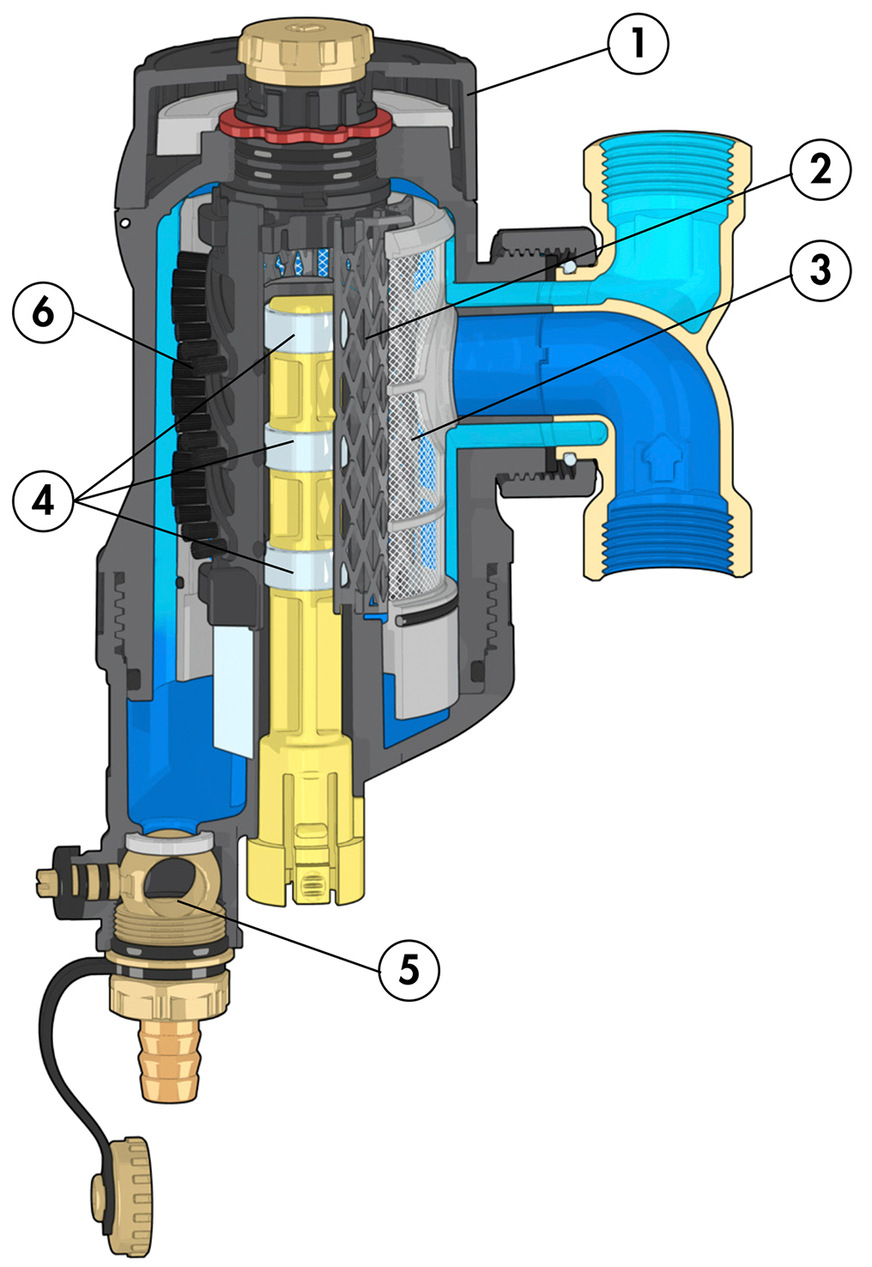 Die Reinigungswirkung der Armatur basiert auf drei Stufen: doppelte Filterwirkung dank zwei radial angeordneter Trenngewebe, ein zentraler Magnet und ein Schmutzfänger im Auslass.