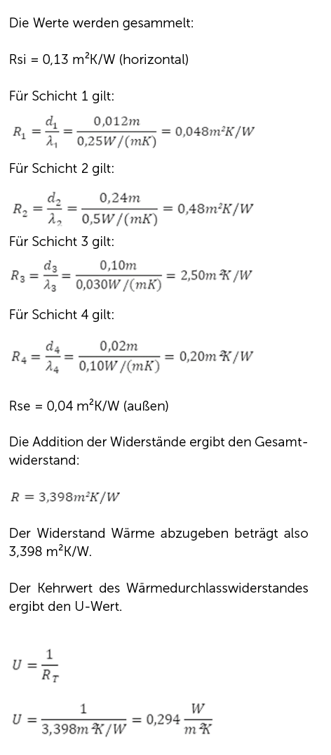 Die Dicke der Schichten alleine ist natürlich nicht das Maß aller Dinge. Wichtig ist es auch, ob die jeweilige Schicht die Wärme gut oder schlecht leitet. Rechnerisch ergibt sich dieser Widerstand „R“ also aus der Dicke, geteilt durch die Leitfähigkeit.