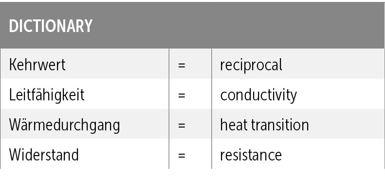 Prüft man diese Formel nach dem Inhalt der eben beschriebenen Behauptungen, ist die Logik ebenfalls hergestellt. Je größer der Wert über dem Bruchstrich (die Dicke), um so größer das Ergebnis (Widerstand). Und je kleiner der Wert unter dem Bruchstrich (Leitfähigkeit), desto größer das Ergebnis (Widerstand). Dann sind noch einige Widerstände als feste Werte anzunehmen; die Wärmeübergangswiderstände: