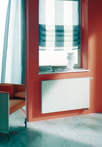 Als Flach- oder Plattenheizkörper bezeichnet man Heizkörper mit geringen Bautiefen. Mit nur 20 bis 150 mm werden sie überwiegend in kleinen Räumen eingesetzt. Plattenheizkörper bestehen aus glatten oder profilierten Stahlblechen, die auf der Rückseite mit Rohren verschweißt werden. Einreihige Plattenheizkörper benötigen für die Erbringung der gleichen Heizleistung eines baugleichen Radiators eine größere Heizfläche. Die Wärmeabgabe erfolgt zu 17% durch Konvektion und zu 83% durch Wärmestrahlung. Plattenheizkörper, die Lamellenschächte auf ihrer Rückseite haben, werden als Kompaktheizkörper bezeichnet. Durch die Anordnung von mehreren angeordneten Lamellenlagen kommt es neben einer Wärmestrahlung noch zu einer zusätzlichen Konvektion. Dies hat den Vorteil, dass sich die Heizleistung erhöht und die Wärmeabgabe an den Wohnraum schneller erfolgt. Kompaktheizkörper sind die zurzeit am meisten verkauften Heizkörpermodelle. Die Produktpaletten verschiedener Heizkörperhersteller bieten Plattenheizkörper und Kompaktheizkörper in ein-, zwei- oder dreilagiger Ausführung mit Lüftungsgitter an. Die Wärmeabgabe bei Kompaktheizkörpern erfolgt zu 60% durch Konvektion und zu 40% durch Wärmestrahlung. Bei Flachheizkörpern gibt es verschiedene Typenbezeichnungen. Heizkörper werden vom Typ 10 bis Typ 33 hergestellt. Die Typenbezeichnung gibt an, wie viele Heizplatten der jeweilige Heizkörper besitzt. Je mehr Heizplatten, desto höher die Wärmeleistung des Heizkörpers.