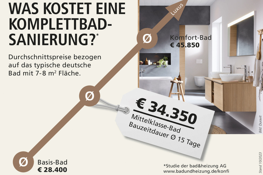 Der Qualitätsstandard von professionell erstellten, modernen Badezimmern ist in punkto Komfort, Sicherheit und Technik nicht mehr mit den Bädern zu vergleichen, die sie ersetzen. Doch mit welchen Kosten müssen Bauherren nun rechnen? Um hierzu einen praxisnahen Richtwert zu erhalten, hat die bundesweit aktive Handwerkerkooperation bad&heizung AG bei ihren Mitgliedern im Oktober 2023 die durchschnittlichen Sanierungskosten und mit 7 bis 8 m² die Durchschnittsgrößen deutscher Bäder ermittelt. Demnach betragen die Kosten inklusive neuer Rohrleitungen, Elektro-, Maler-, Maurer- und Fliesenarbeiten für ein Bad mittlerer Ausstattung durchschnittlich 34.350 Euro.