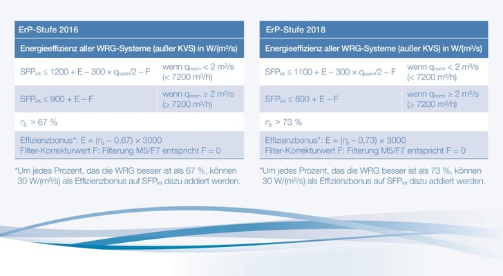 Besonders relevant für die Energieeffizienz sind der Temperaturwirkungsgrad, die spezifische Ventilatorleistung (SFP) und der interne Druckverlust. Ein-Richtungs-Lüftungsgeräte, also Anlagen, die eine reine Zu- oder Abluftanlage sind, müssen eine Mindestventilatoreffizienz erfüllen, die je nach elektrischer Leistung von über oder unter 30 kW unterschiedlich ist. Zwei-Richtungs-Lüftungsgeräte, die über ein Zu- und Abluftgebläse verfügen, müssen zusätzlich zu einem definierten SFP-Wert auch einen festgelegten Wärmerückgewinnungsgrad erfüllen. Dieser lag 2016 noch bei 67% und wurde jetzt auf 73% angehoben. Auch für Wohnraumlüftungsgeräte gibt es neue Vorschriften: Sie müssen ab sofort deutlich mehr Primärenergie einsparen als sie verbrauchen. Aus diesem Grund fallen die Energieklassen F und G auf dem Label vollständig weg und dürfen nicht mehr eingebaut werden.