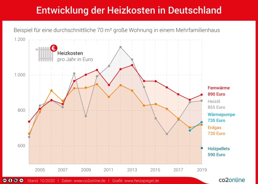 Die Vorausschau für den Abrechnungszeitraum 2020 zeigt: Verbraucher, die mit Erdgas heizen, können mit stabilen Kosten rechnen. Wie die Heiz-Experten von co2online prognostizieren, steigen die Kosten für das Heizen mit Wärmepumpen weiter (circa + 4 Prozent), während die für Fernwärme (circa - 2 Prozent), Holzpellets (circa - 4 Prozent) und Heizöl (circa - 18 Prozent) voraussichtlich sinken.
