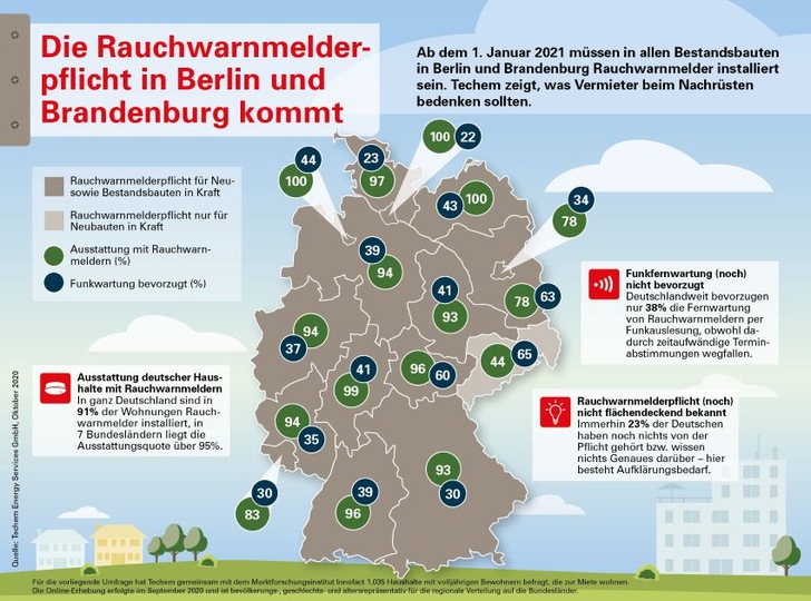 Ab dem 1. Januar 2021 müssen in allen Bestandsbauten in Berlin und Brandenburg Rauchwarnmelder installiert sein. Laut einer Studie muss rund jeder vierte Haushalt noch ausgestattet werden. Techem zeigt, was es für Mieter und Vermieter jetzt zu beachten gilt.