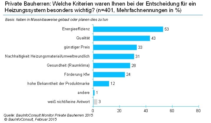 Für 43 Prozent der Befragten ist die Qualität der neuen Heizung auch ein weiteres wichtiges Auswahlkriterium. Aber auch ein günstiger Preis und die Befeuerung des Heizungssystems über nachhaltige Heizungsmaterialien spielt für ca. ein Drittel der privaten Bauherren eine wichtige Rolle.