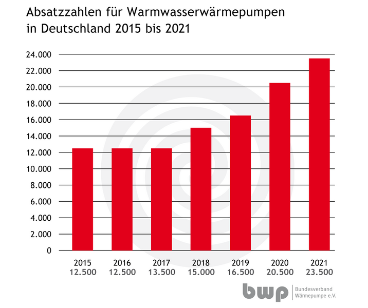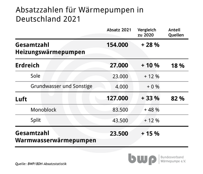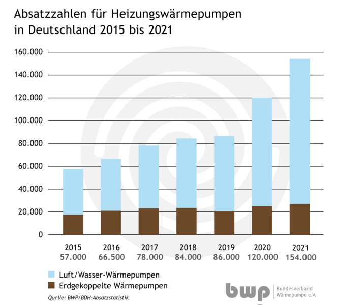 Luft-Wasser-Systeme konnten 2021 Ihren Marktanteil mit 82 Prozent erneut leicht vergrößern (2020: 79 Prozent), erdgekoppelte Systeme hatten einen Marktanteil von 18 Prozent. Bei reinen Warmwasser-Wärmepumpen stieg die Zahl der abgesetzten Geräte um 15 Prozent gegenüber dem Vorjahr, 23.500 Geräte wurden installiert.