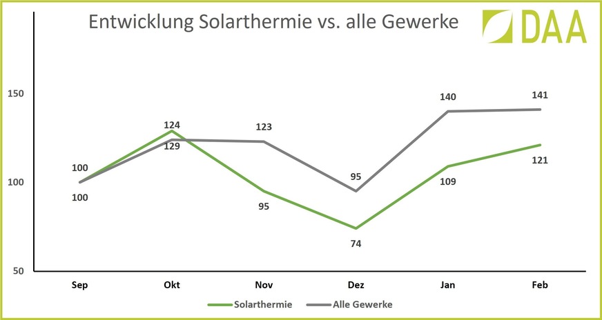Ebenfalls auf Wachstumskurs ist das Interesse an der Ausstattung des Eigenheims mit Solarthermie: DAA stellte allein im Februar 2022 gegenüber dem Vormonat ein Plus von 10 % fest, also 9 % mehr als für alle anderen Gewerke zusammen. Erstaunlich, da die Wachstumsrate von Solarthermie und den anderen Gewerken in den Vormonaten nahezu identisch hoch war. Wenngleich die positive Entwicklung bei den Solarthermie-Anfragen im Februar 2022 besonders deutlich war, hatte sie sich bereits im Vorjahr abgezeichnet. Im gesamten Jahr 2021 hatten sich die Solarthermie-Nachfragen gegenüber 2020 bereits um 43 % erhöht.