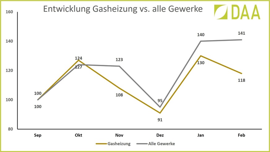 Während es bei den regenerativen Heizungssysteme Wärmepumpe und Solarthermie im Frühjahr 2022 angesichts stark steigender Energiepreise deutliche Zuwächse gab, sieht es bei der in der Vergangenheit stets beliebten Gas-Heizung ganz anders aus. DAA hat sich die Entwicklung der Online-Anfragen nach Gasheizungen zwischen September 2021 und Februar 2022 angesehen und ebenfalls mit allen anderen Gewerken verglichen.