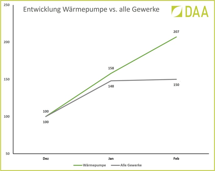 Die Heizungs-Wärmepumpe ist gefragt wie nie: Von Dezember 2021 bis Februar 2022 verdoppelte sich die Nachfrage – während die Anfragen nach allen anderen Gewerken zusammen lediglich 50 % gestiegen sind. Im Februar 2021 betrug das prozentuale Wachstum an Anfragen nach Wärmepumpen im Vormonatsvergleich 31 % – bei sämtlichen anderen bei DAA gelisteten Gewerken gab es kaum Veränderung.