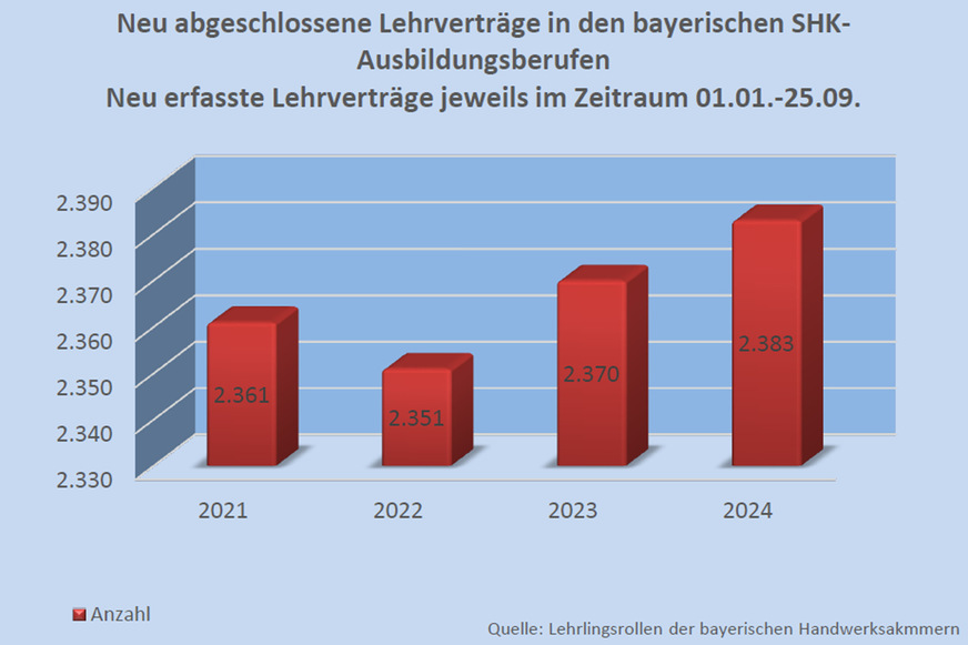 Die Ausbildungsentwicklung im SHK-Bereich verzeichnet einen positiven Trend, da die Zahl der neu erfassten Lehrverträge kontinuierlich gestiegen ist. Im Vergleich zum Vorjahr 2023 mit 2370 Lehrverträge konnten im Jahr 2024 bereits 2383 Lehrverträge verzeichnet werden.