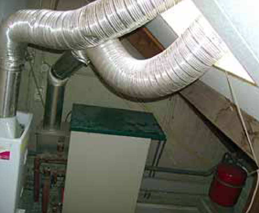 Diese Abgasführung wurde wohl gewählt, um den ohnehin belasteten Geldbeutel des Auftraggebers zu schonen. Dachfenster auf, Tröten raus und fertig . . .