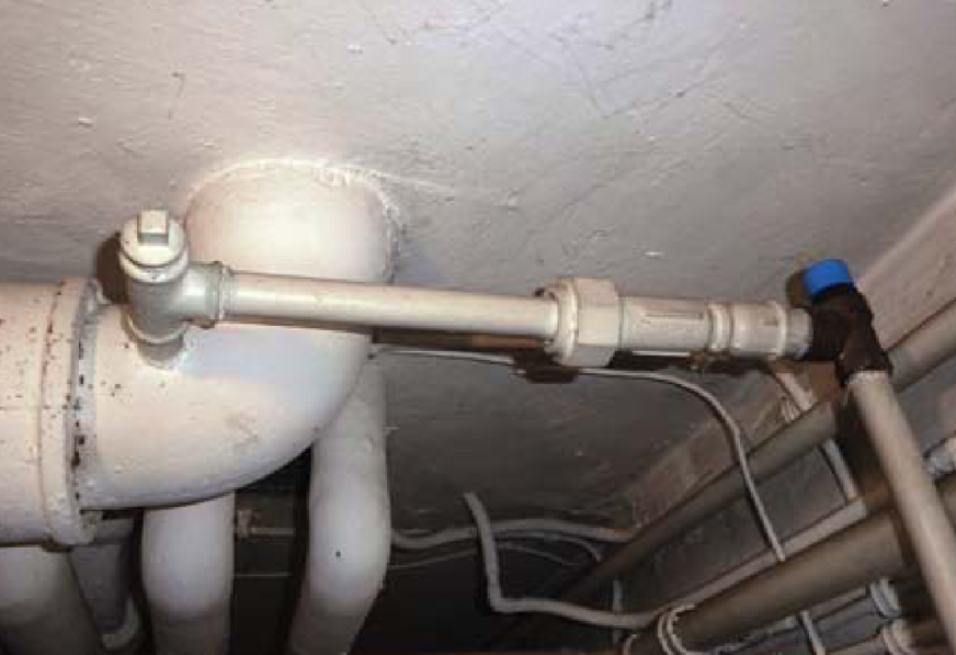 Was hier gezeigt wird, war noch niemals erlaubt und besitzt auch keinen Bestandsschutz. Die Abblasleitung eines Sicherheitsventils (SV) direkt in eine Abwasserleitung zu führen, birgt ein hohes Verkeimungsrisiko. Und was soll bitte passieren, wenn die Abwasserleitung tatsächlich mal verstopft ist und das Abwasser zurück ins Trinkwasser drückt? Iggit, darüber möchte ich gar nicht weiter nachdeneken. Da fällt es schon fast nicht mehr auf, dass die Leitung zum SV viel zu lang ist.